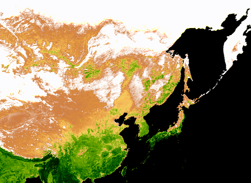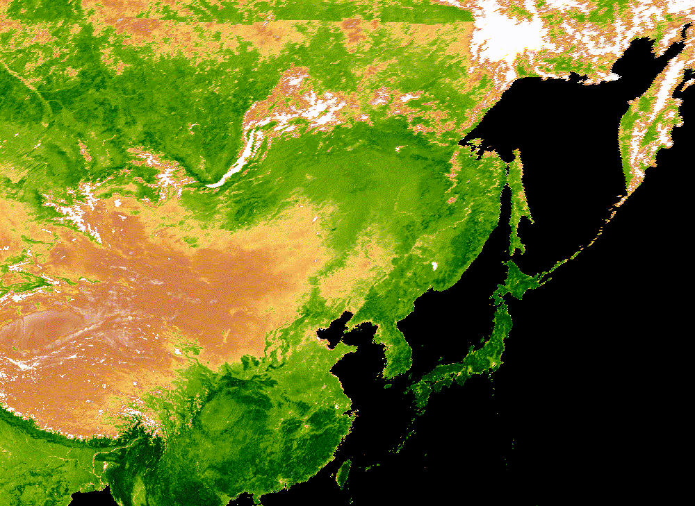 asia_ndvi_2019 = asia_ndvi.filterDate('2019-01-01', '2019-12-31')If we now generate a visualization (defining some parameters previously), we get a link that points to the following: