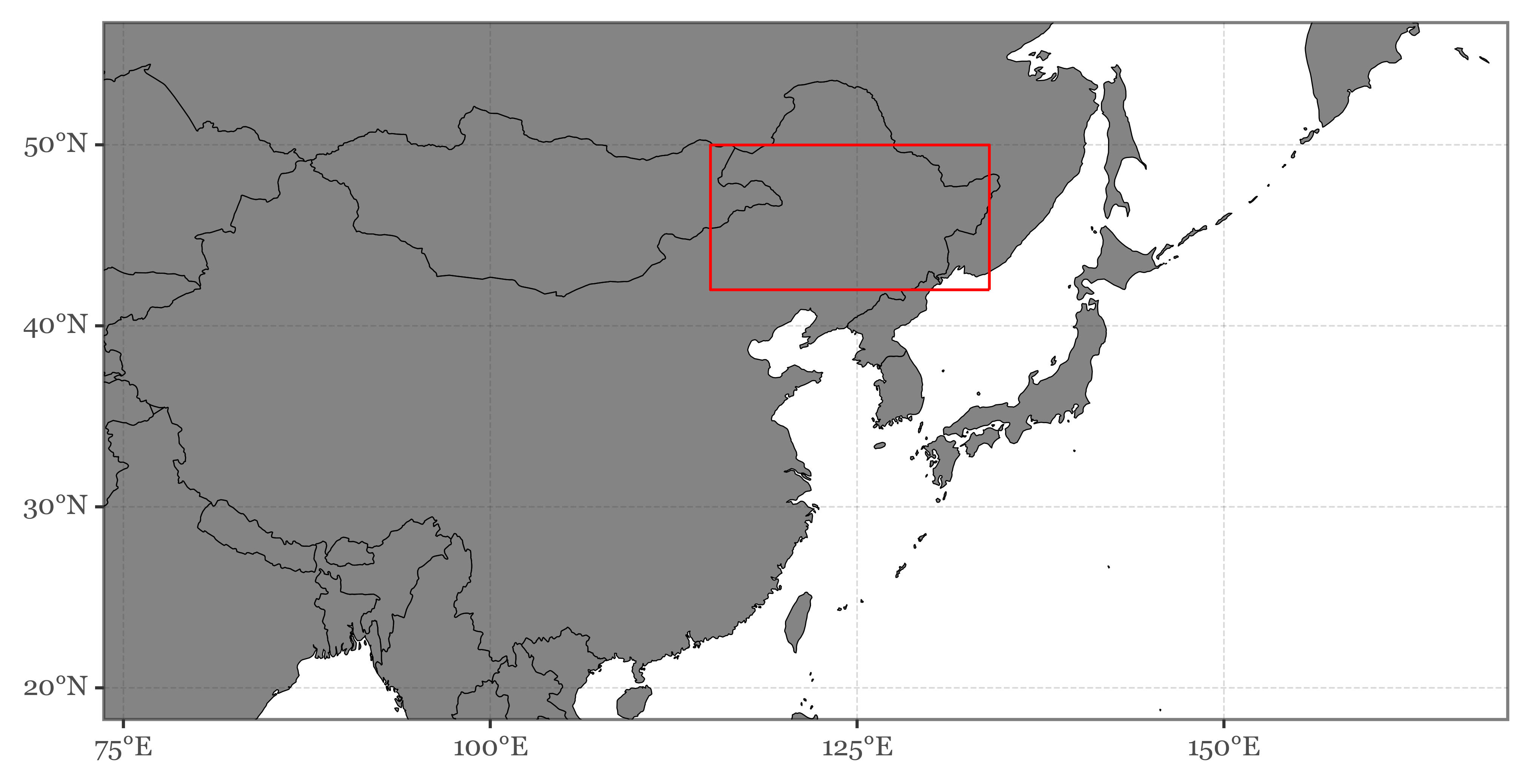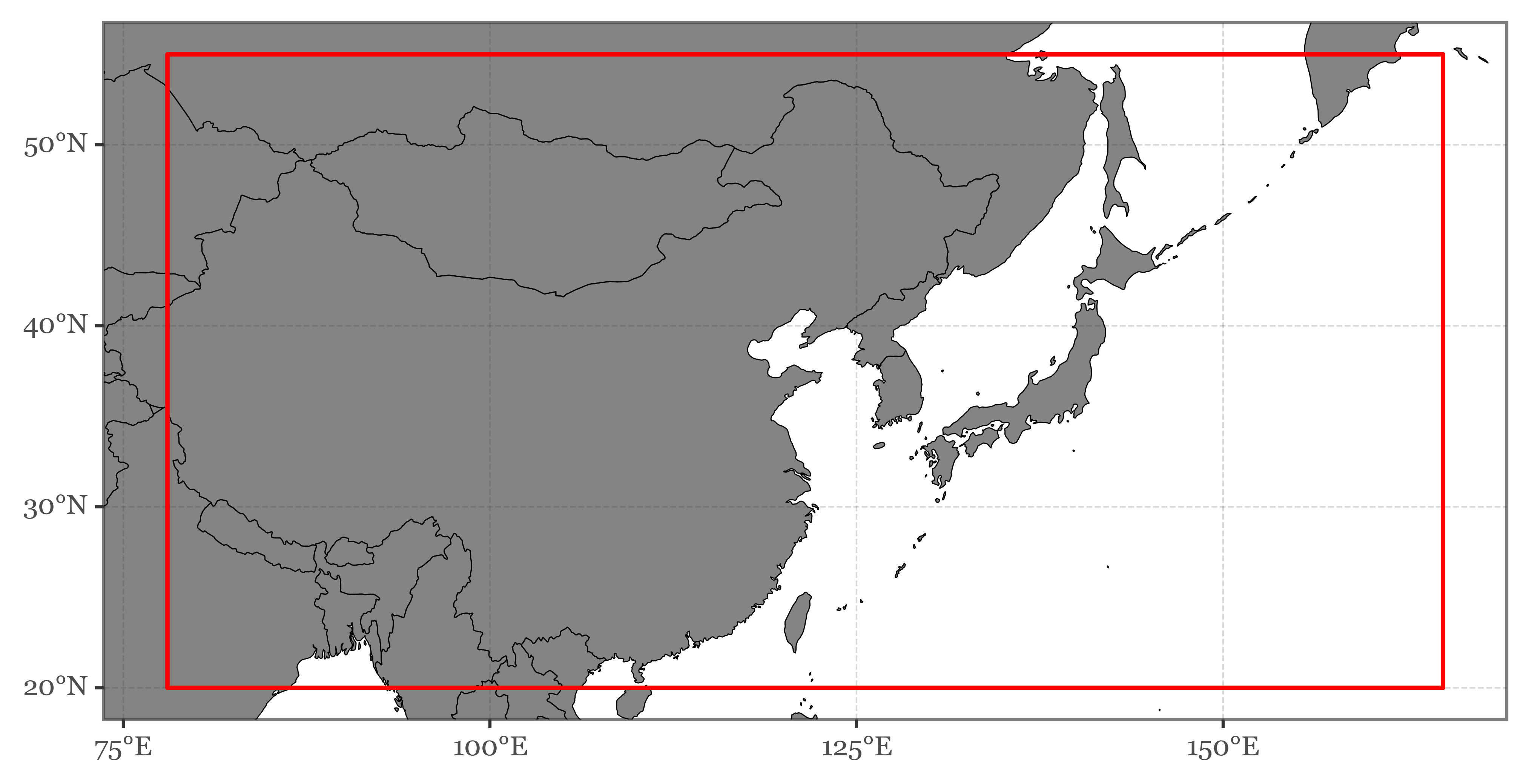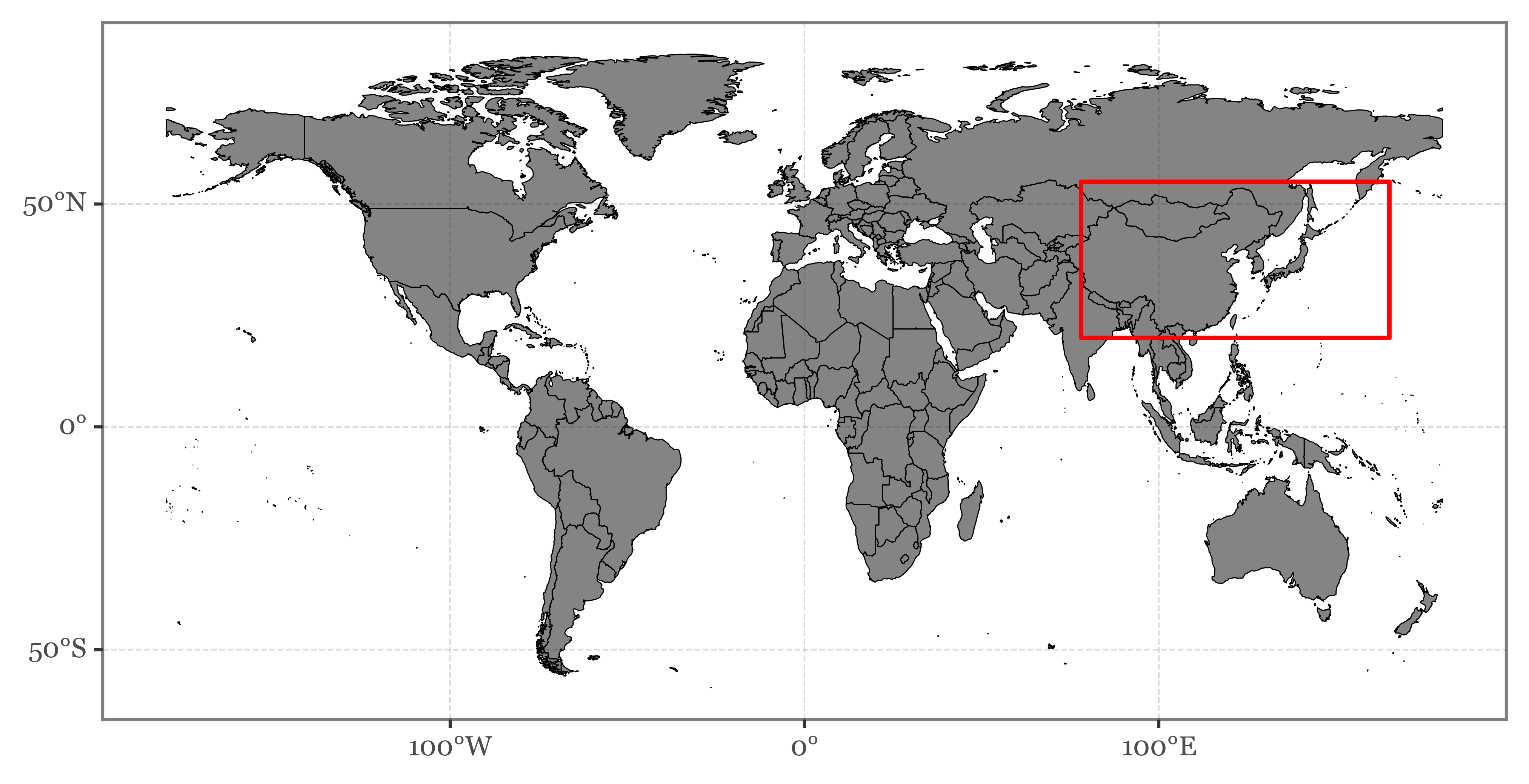 Since we are interested in the vegetation dynamics in Asia, we are going to focus on the region between 20°N - 60°N and 78°E - 165°E. We can select this region by defining a bounding box and then filtering the data by the bounding box coordinates.
