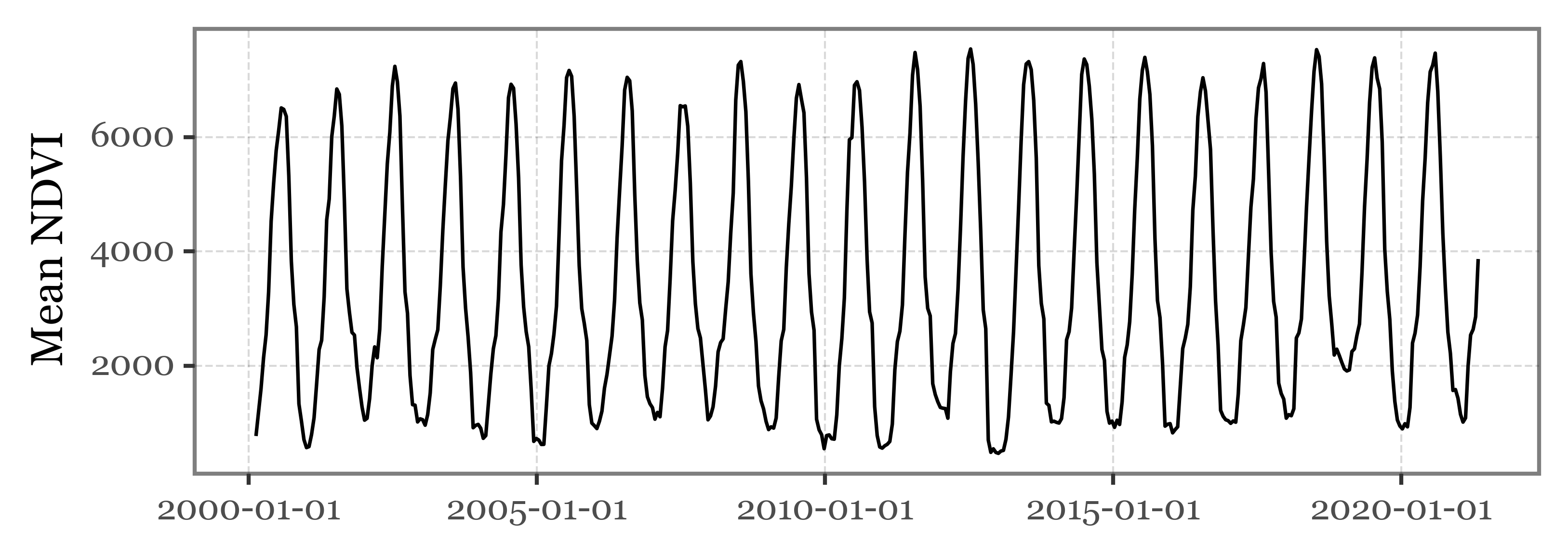 We are going to use the MOD13A2 data product, which is a 16-day composite of the Terra MODIS satellite imagery. The data is available starting from 2000-02-18 for the whole globe at a spatial resolution of 1000 m.