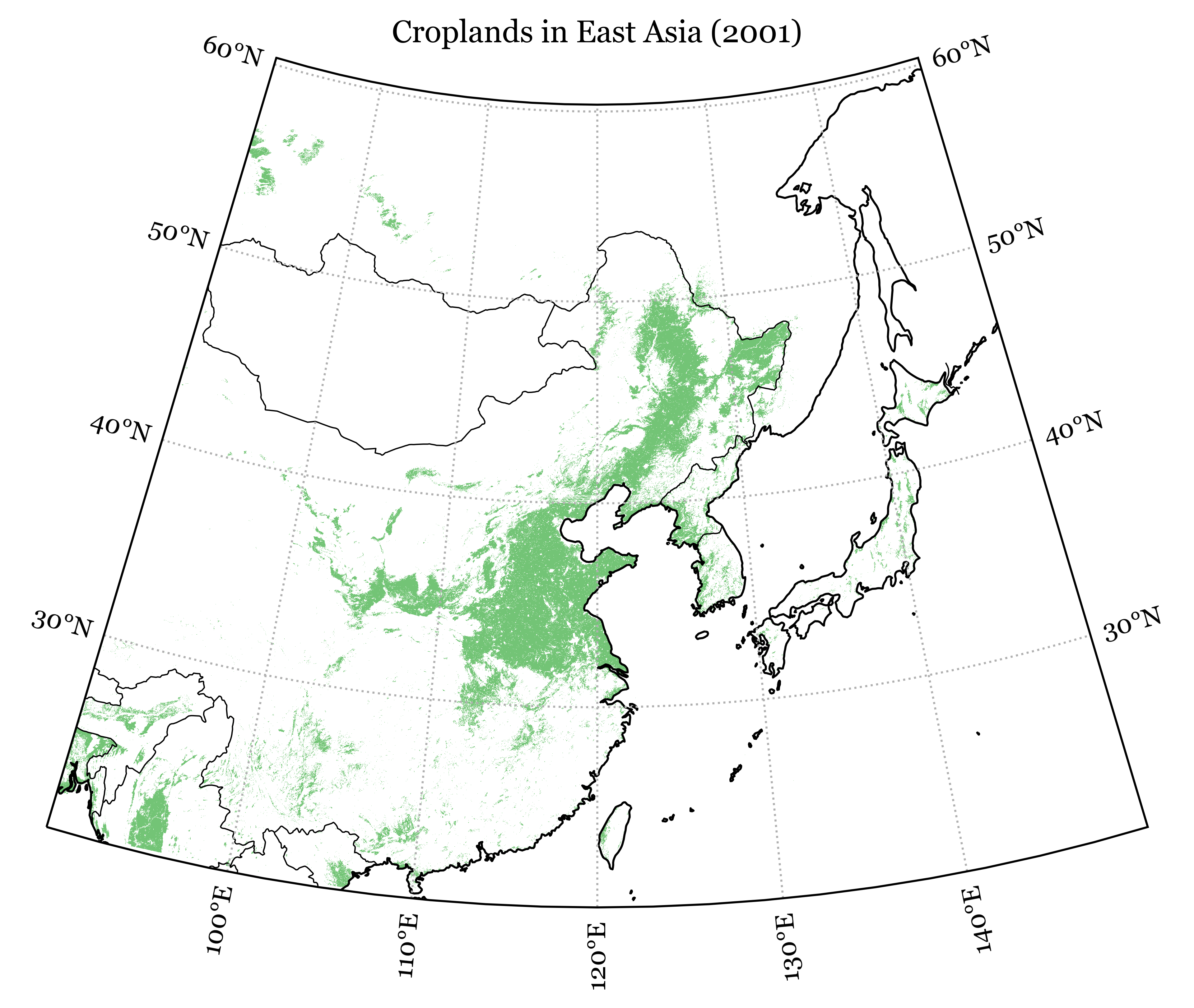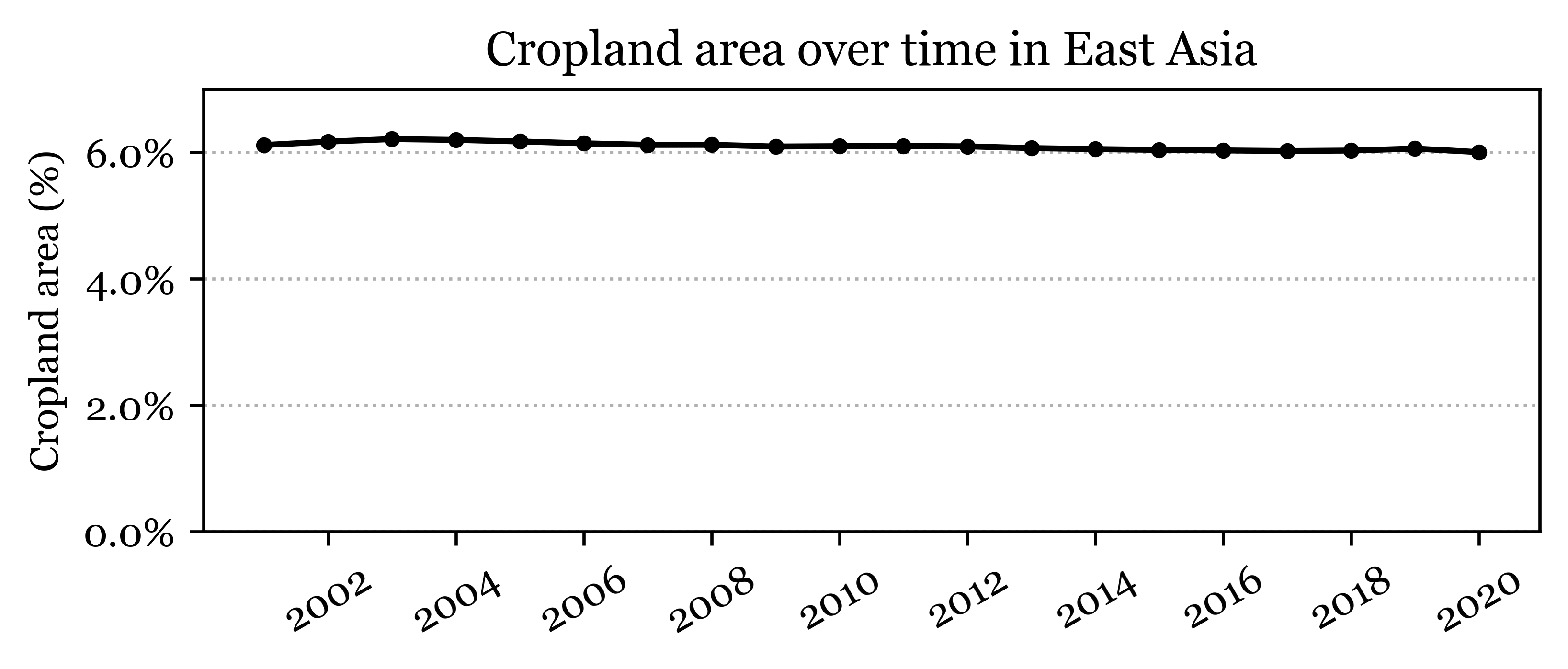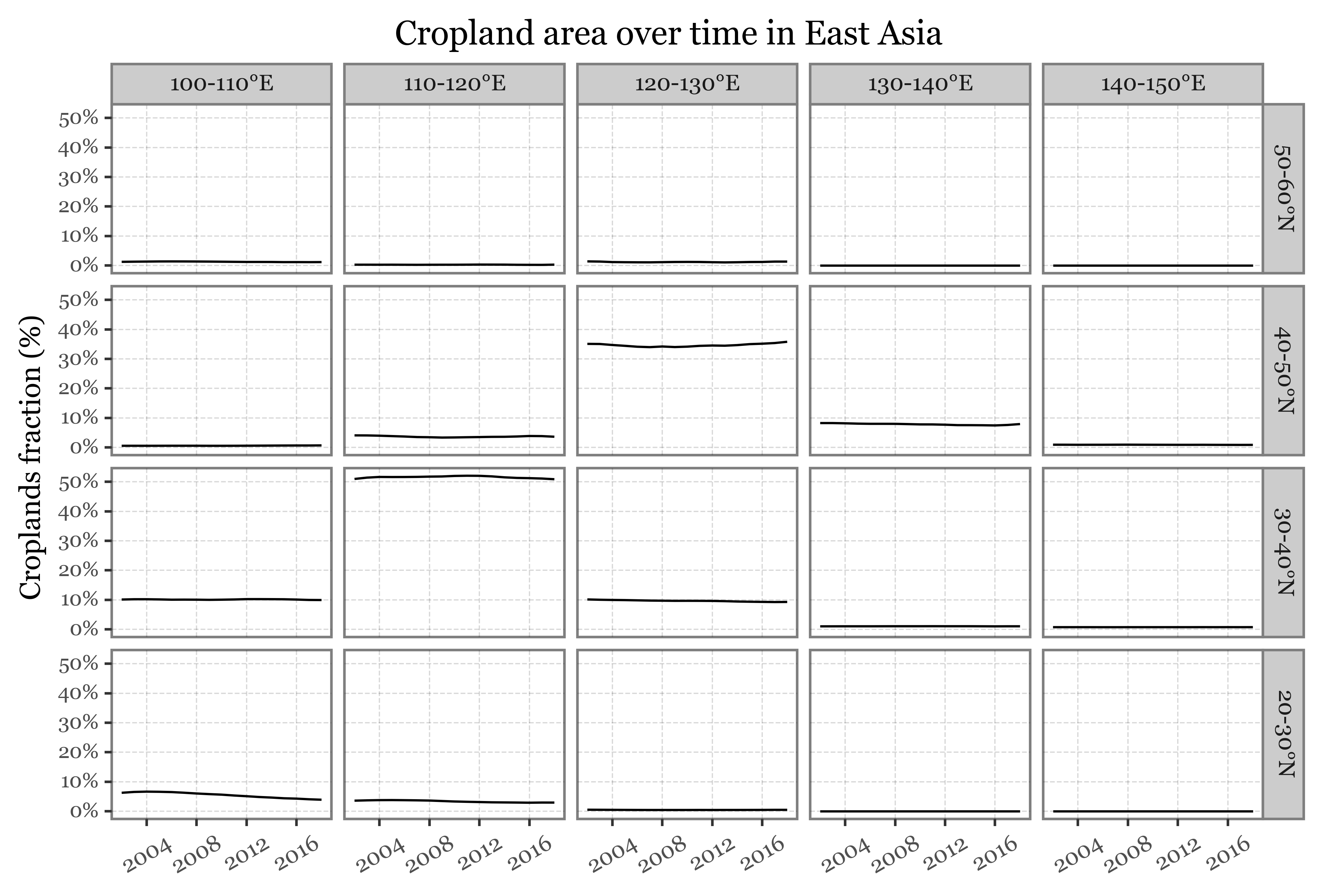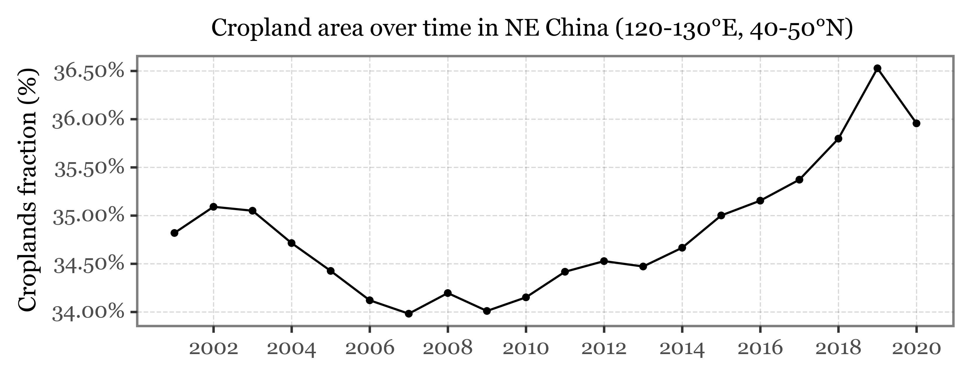 + p9.labs(x='', y='Croplands fraction (%)', title='Cropland area over time in NE China (120-130°E, 40-50°N)')