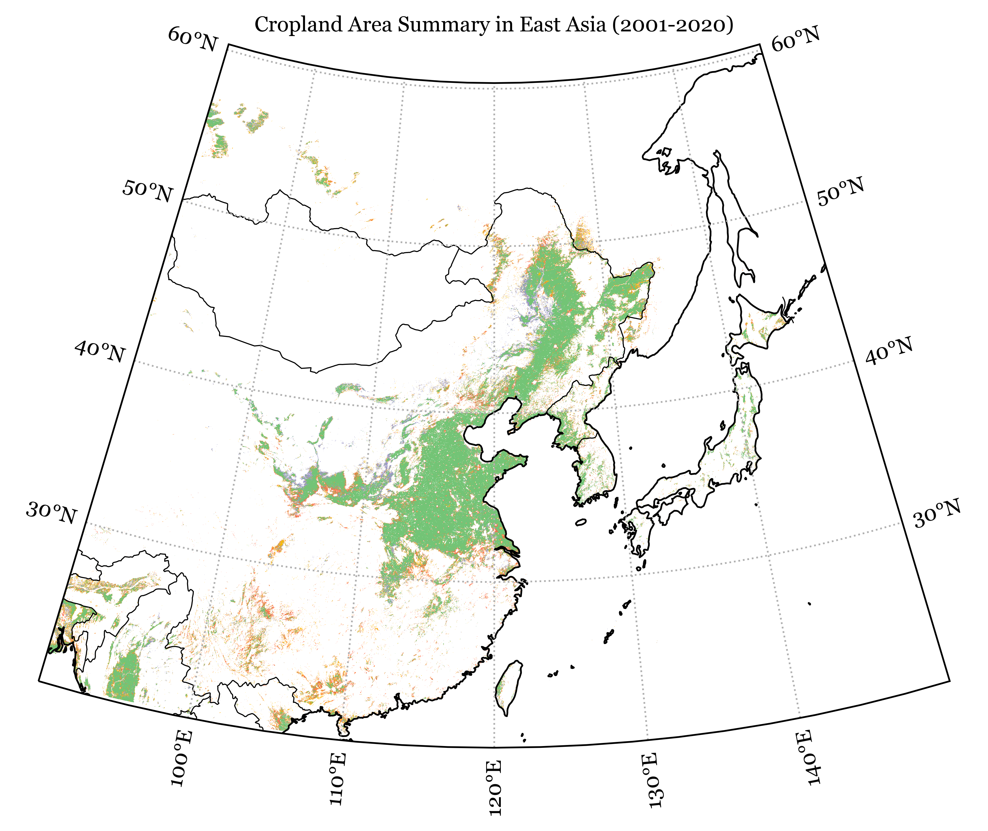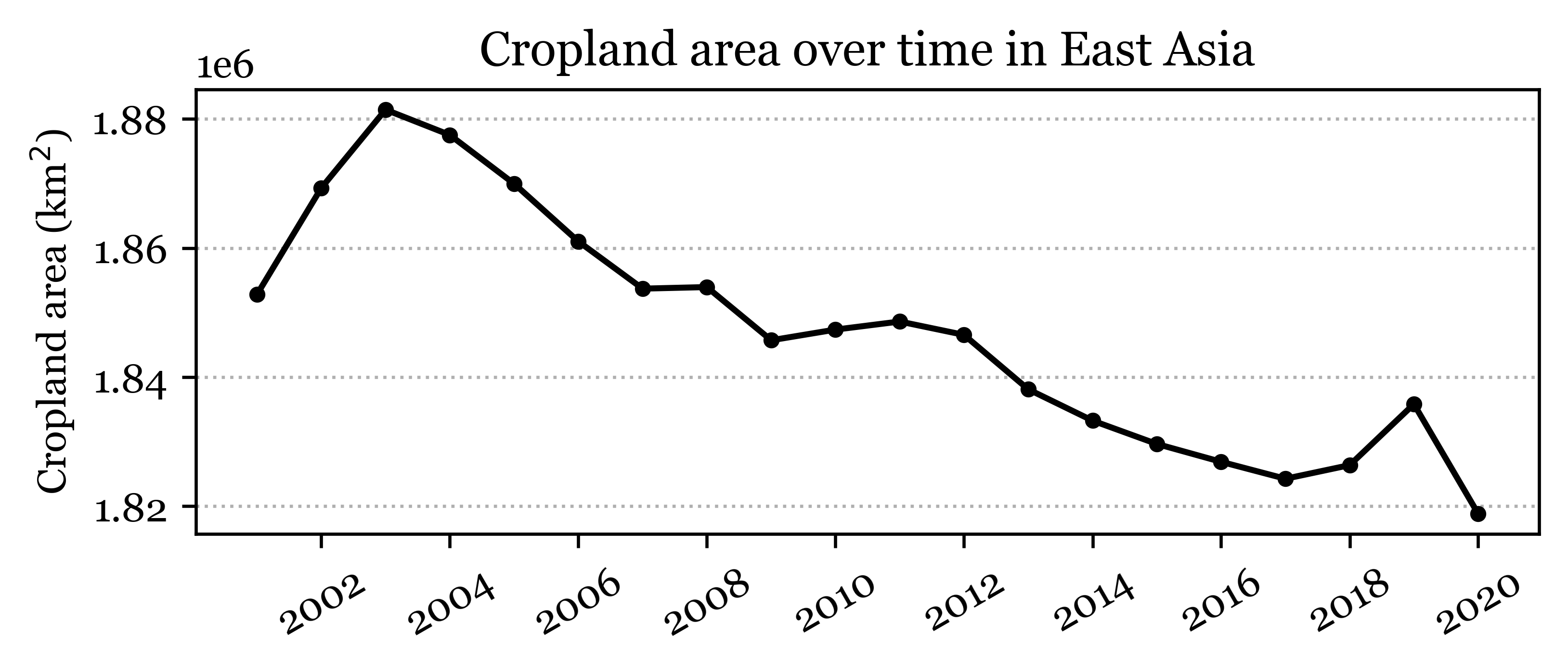 plt.title('Cropland Area Summary in East Asia (2001-2020)', size=10)